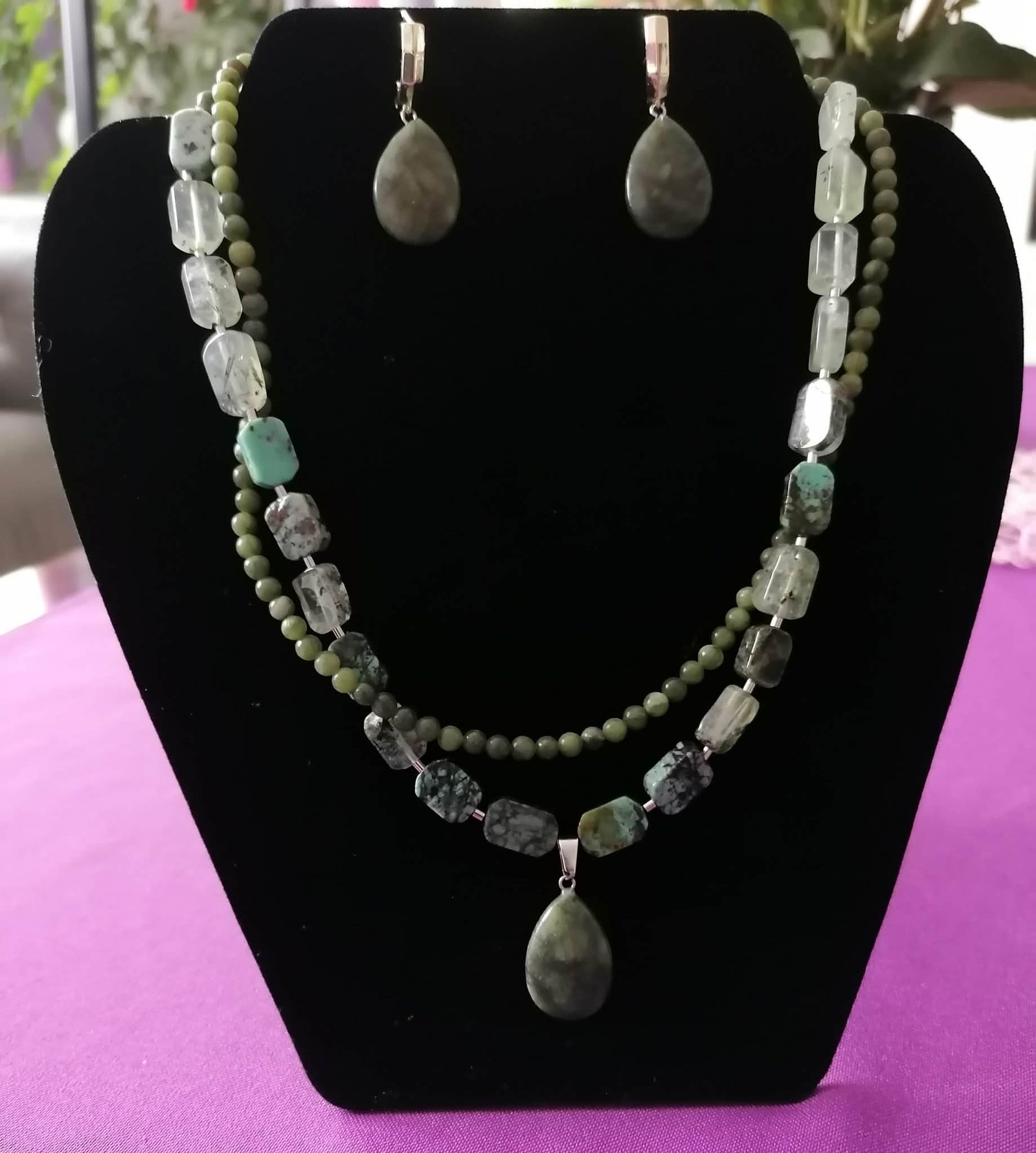 Adorn yourself with a unique and elegant double-layer necklace featuring natural stones, carefully selected for their mesmerizing beauty. This refined jewelry piece is more than just an accessory—it combines sophistication with a touch of natural charm, making it a perfect addition to your wardrobe. Its timeless design ensures that it complements both everyday looks and special occasions with grace.